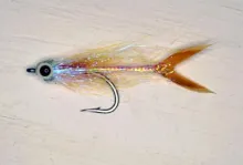 | Tail | Two Whiting Hen Saddle feathers, ginger. 1½ inch (3 centimeters) of small Mylar tubing, color Pearl. Deer Creek Diamond Fine Flex to reinforce. |