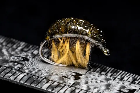 - Dub the body, pull the ribbon over the top and tie in. Trim off the waste, build a small head, whip finish and cut the thread.