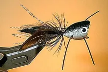 Like many of Dron’s flies it incorporates foam. It utilizes the foam for flotation, some braided tubing to form a body and eyes and flash and yarn fibers to make a tail. This makes it a perfect little colorful fish frantically escaping in the surface, making bubbles and noise thanks to its cupped front. It will also go zigging and zagging each time it’s stripped in, and as an added attractor Dron as mounted a rattler in the rear of the fly, yielding an even noisier fly. You can see it in action in the video below. It's a great fly for bass and other fish that react to some surface commotion.